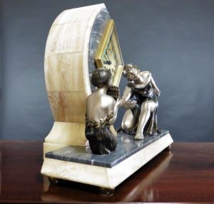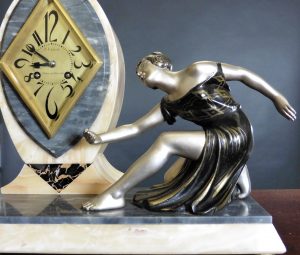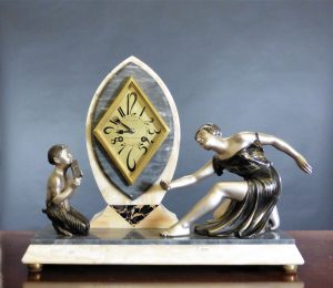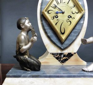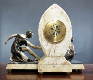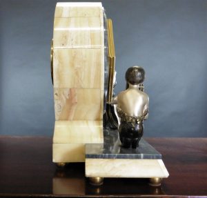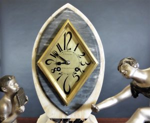 Art Deco mantel clock standing on a cream and grey marble base resting on four brass bun feet supporting an ovoid shaped top housing a gilded diamond shaped bezel.