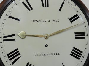 The original Thwaites family of clockmakers can be traced back to the early part of the 17th century when Ainsworth Thwaites begun working from Rosman Row in 1740, he was a member of the Clockmakers Company from 1751 to 1780 his sons Benjamin and James formed a partnership with George Jeremiah Reed  (member of the Clockmakers Company in London from 1816 to 1823) to become known as Thwaites and Reed in 1826.  They soon established themselves as one of the most important clockmaking firms in the country.  As well as making clocks for themselves they made movements for some of the most famous names of the day such as Vuillamy, Ellicott, Dutton and Elliott.  The firm is still trading today and looks after Big Ben.