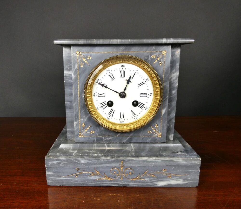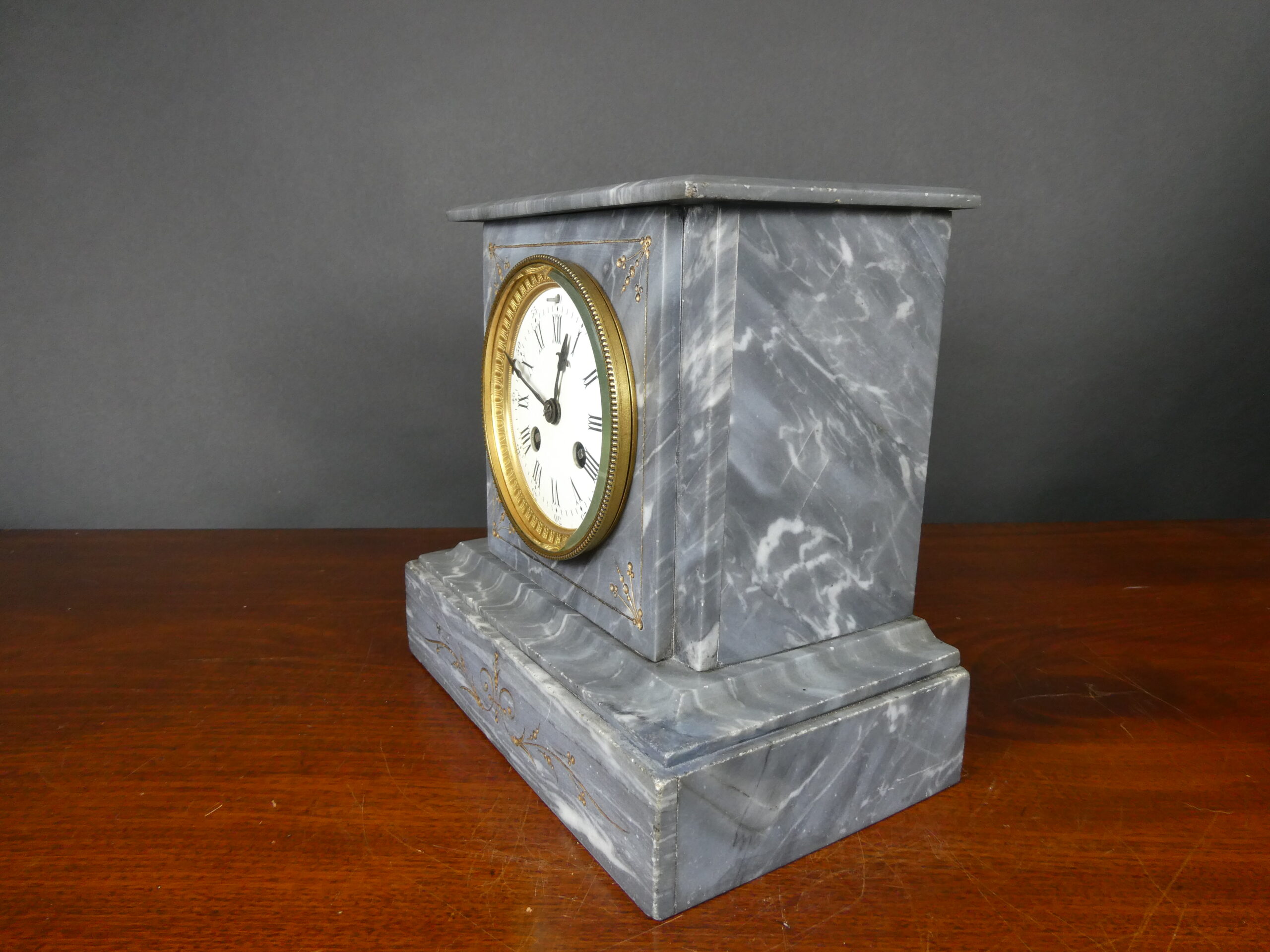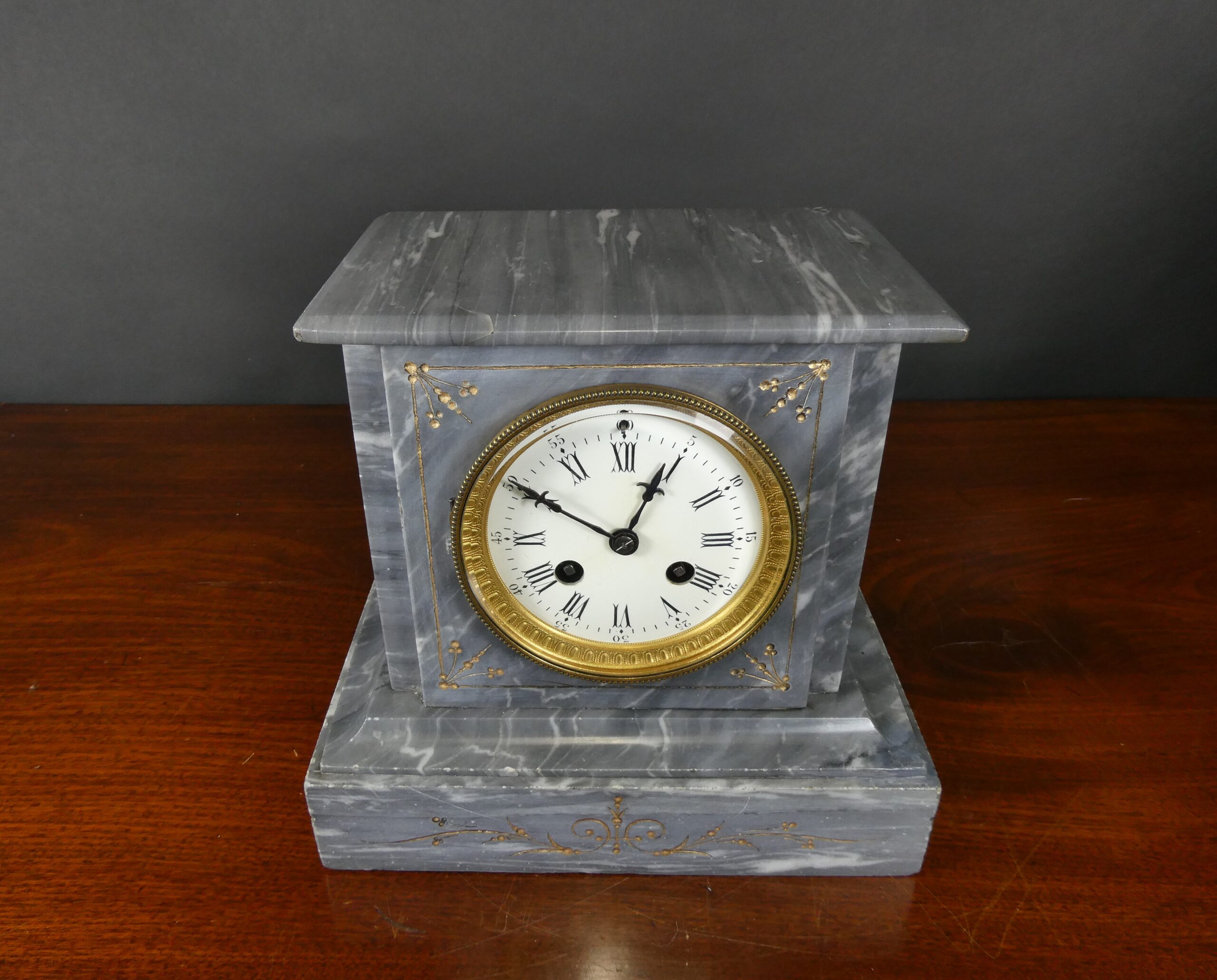 French mantel clock housed in a flat top grey marble case with gilded decoration.