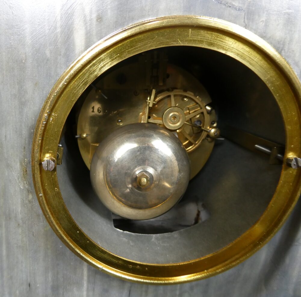 Eight day French movement with anchor escapement striking the hours and halves on a silvered bell, the backplate numbered 16357.