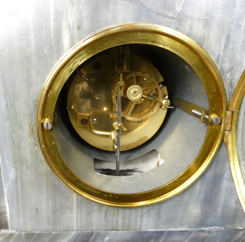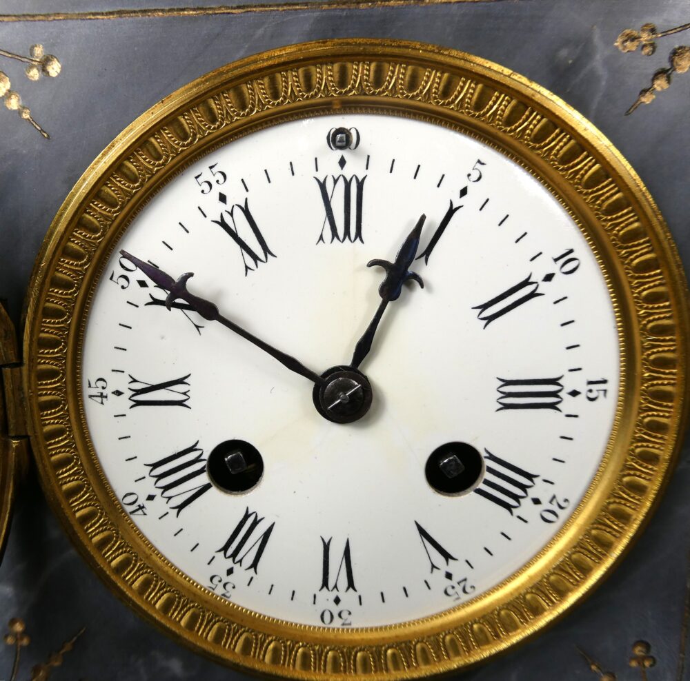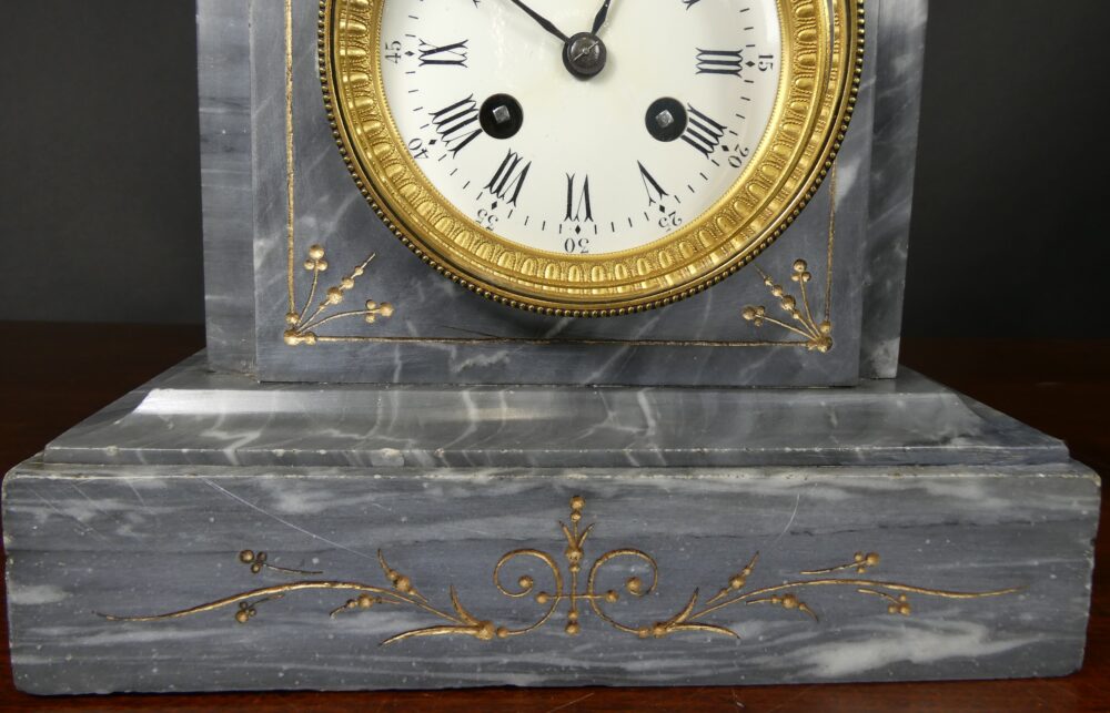 French mantel clock housed in a flat top grey marble case with gilded decoration.