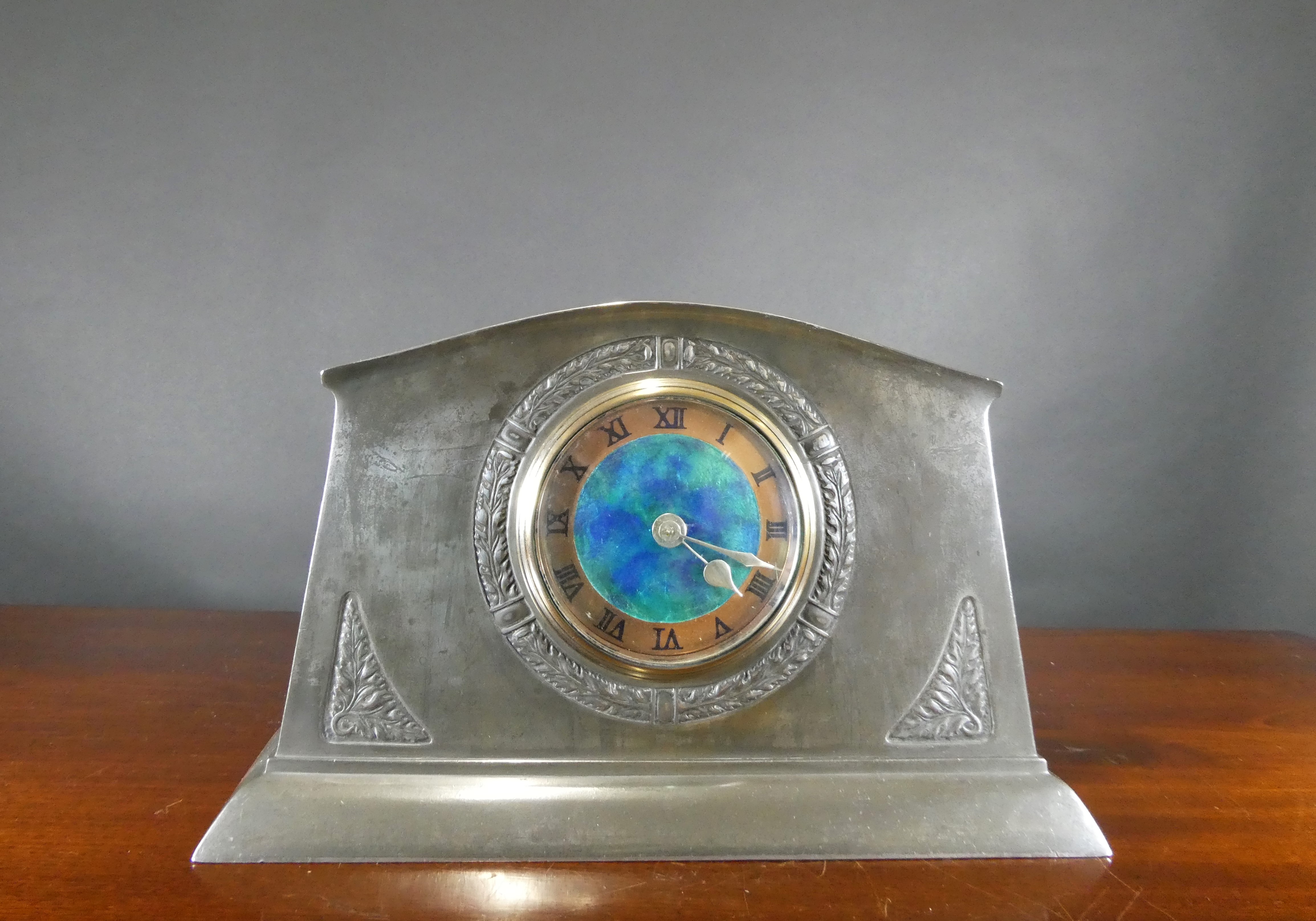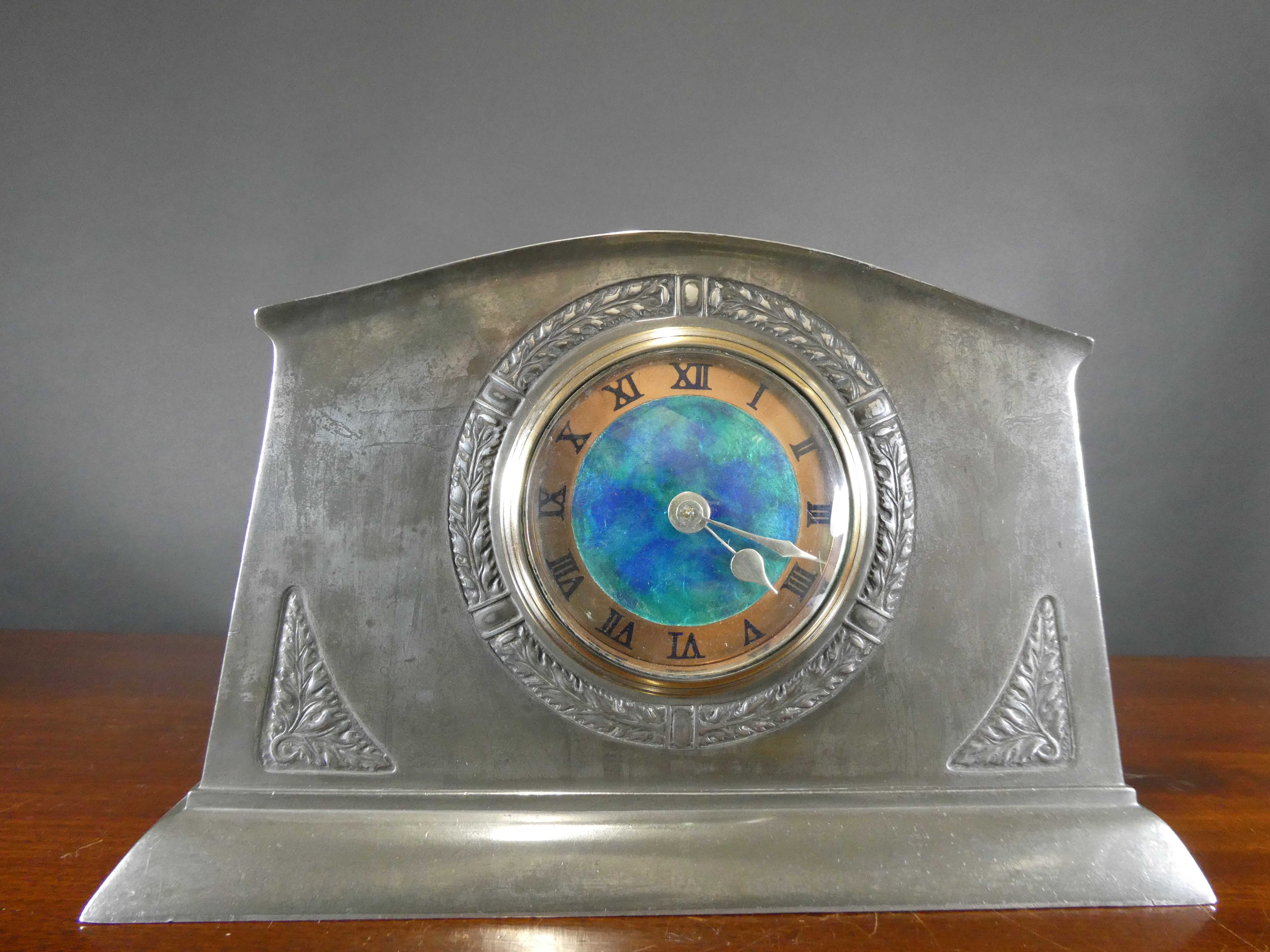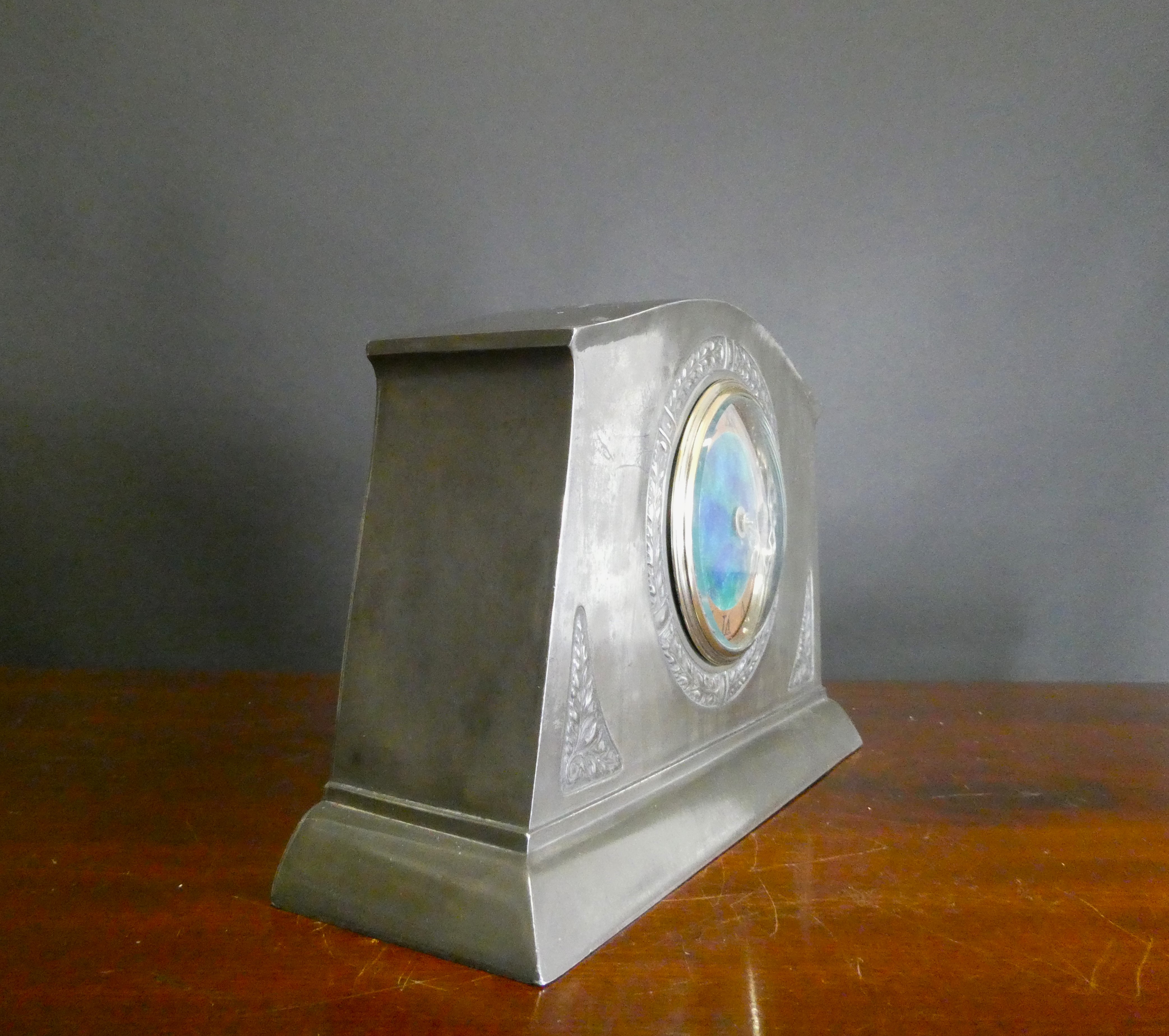Liberty & Co Tudric mantel clock from a design by Archibald Knox, low arched English pewter case with foliate decoration and corner panels.
