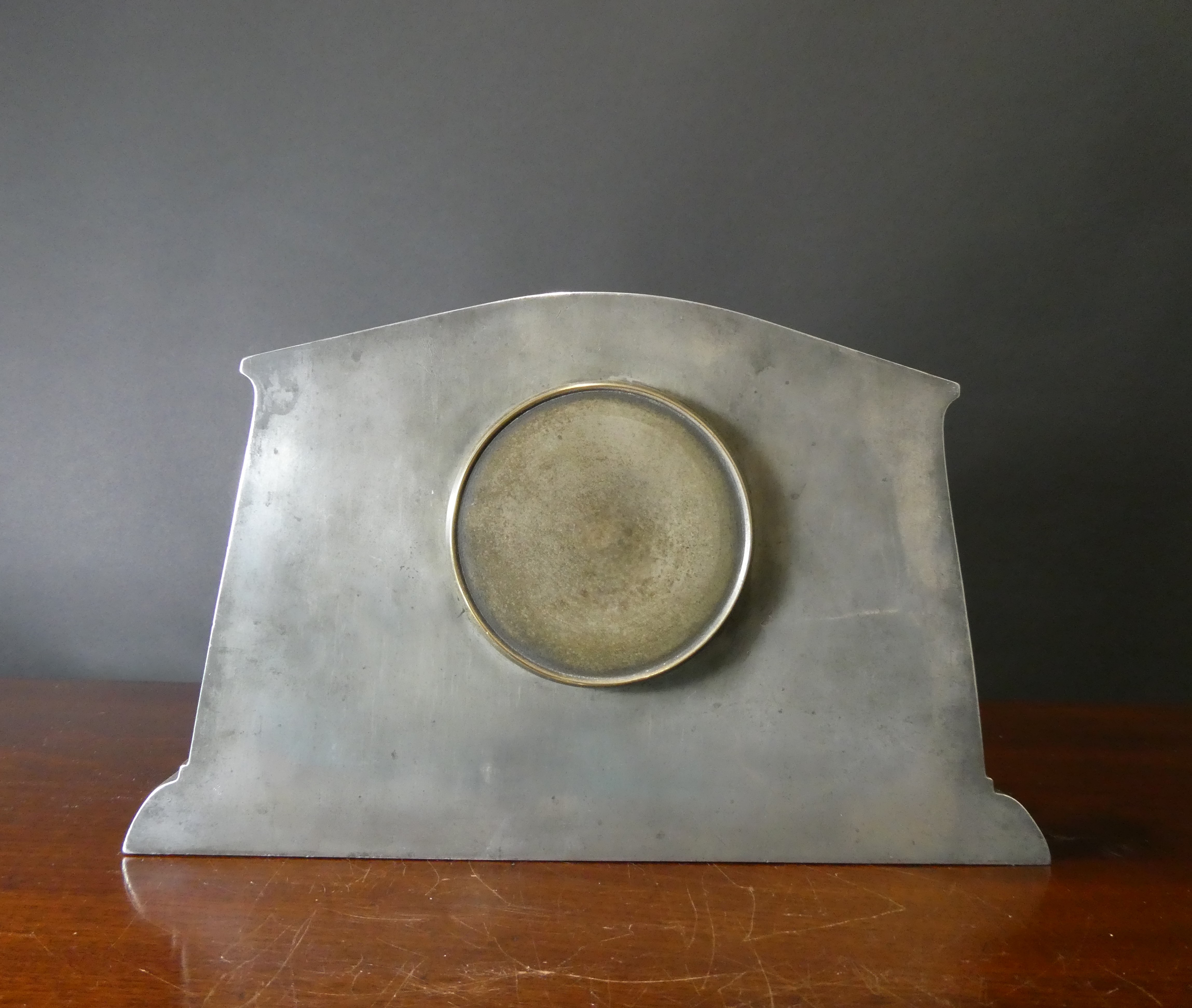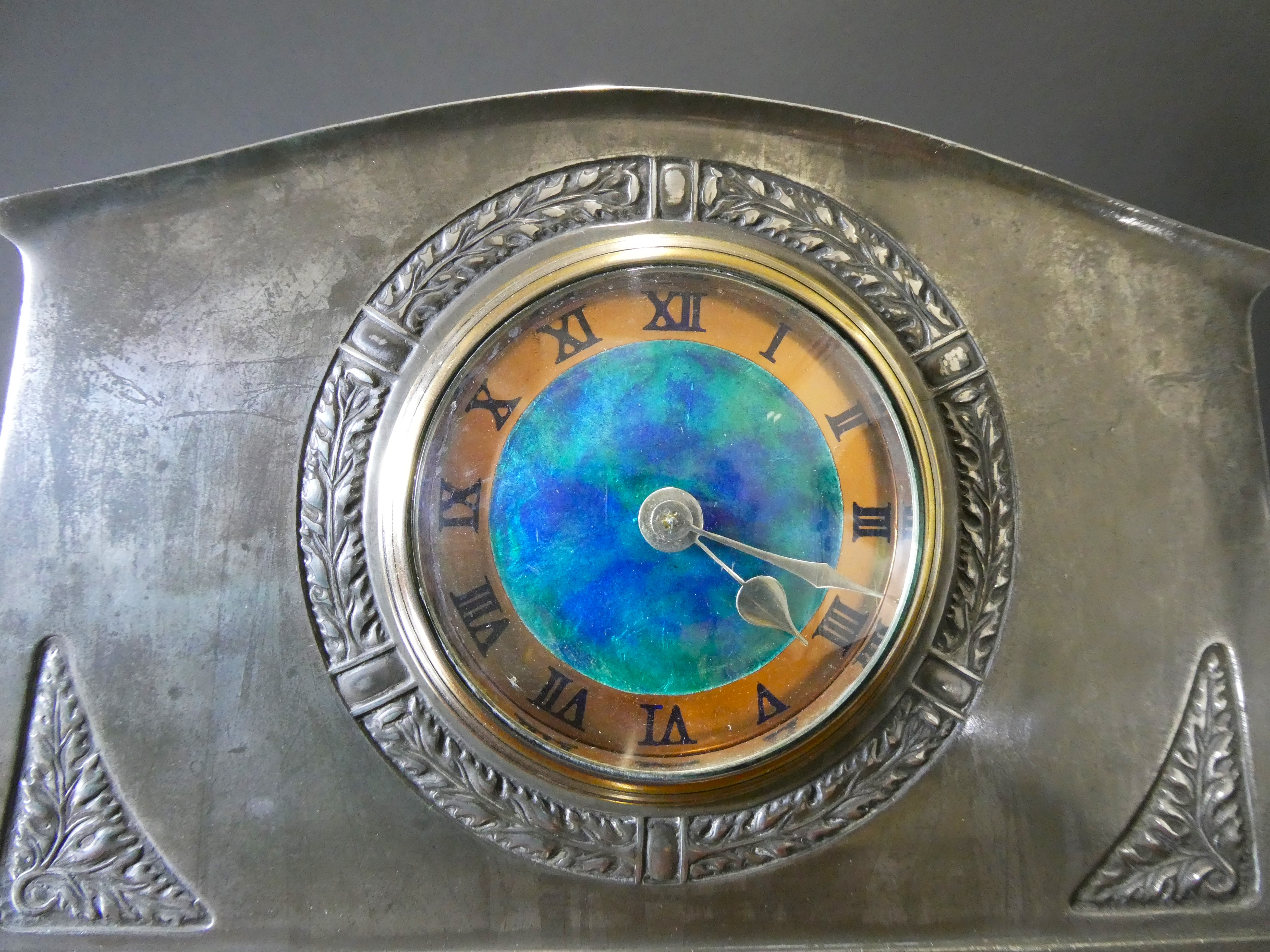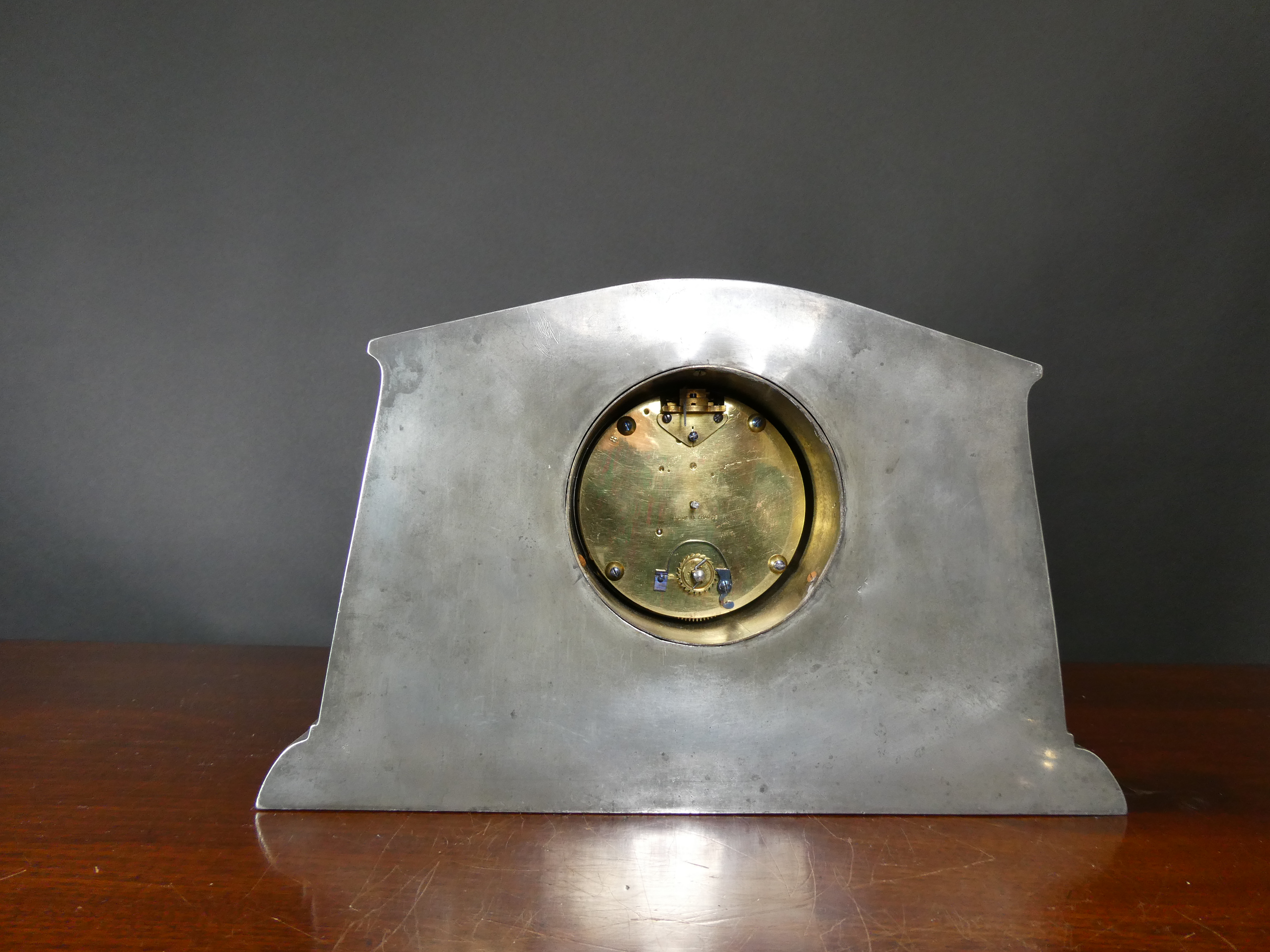 Liberty & Co Tudric mantel clock from a design by Archibald Knox, low arched English pewter case with foliate decoration and corner panels.