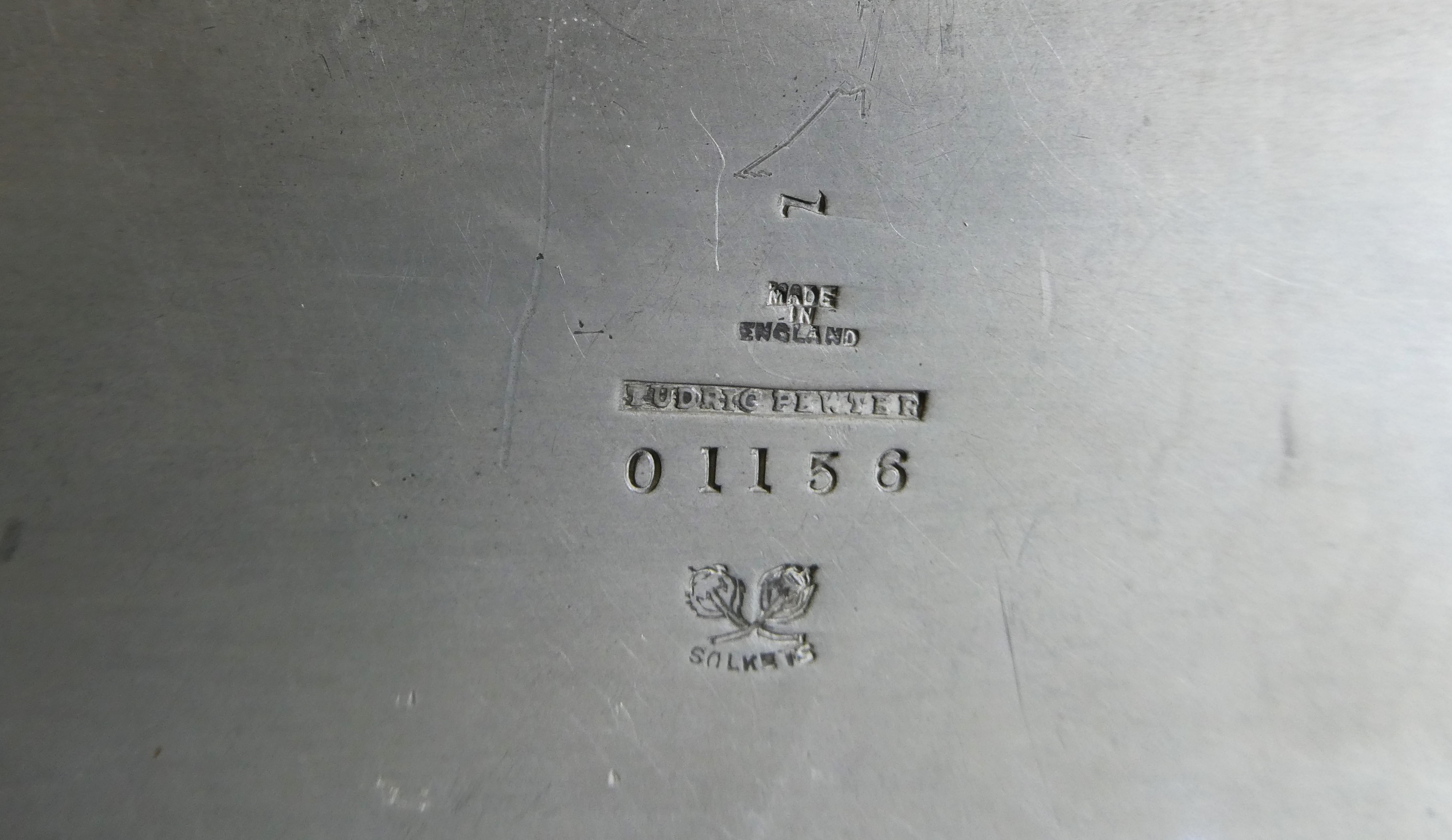 Liberty launched its Cyrnic ( silver) range in 1899 followed by it’s Tudric range in 1902. They invested in the Birmingham firm of WH Haseler ( using the Solkets mark) Haseler reportedly manufactured all pewter ware for Liberty until 1926. Not only using the ‘Solkets’ mark but others including ‘English pewter’. The Tudric range used innovative designs by designers including David Veasey and Archibald Knox.