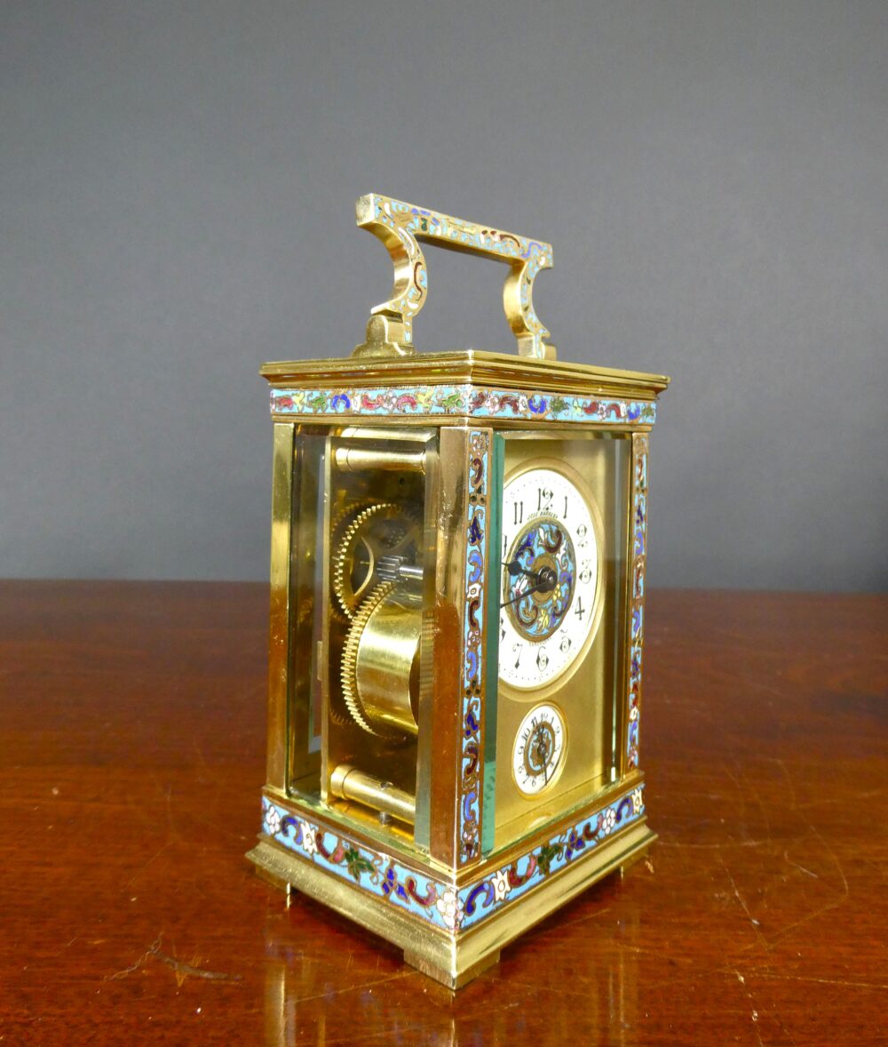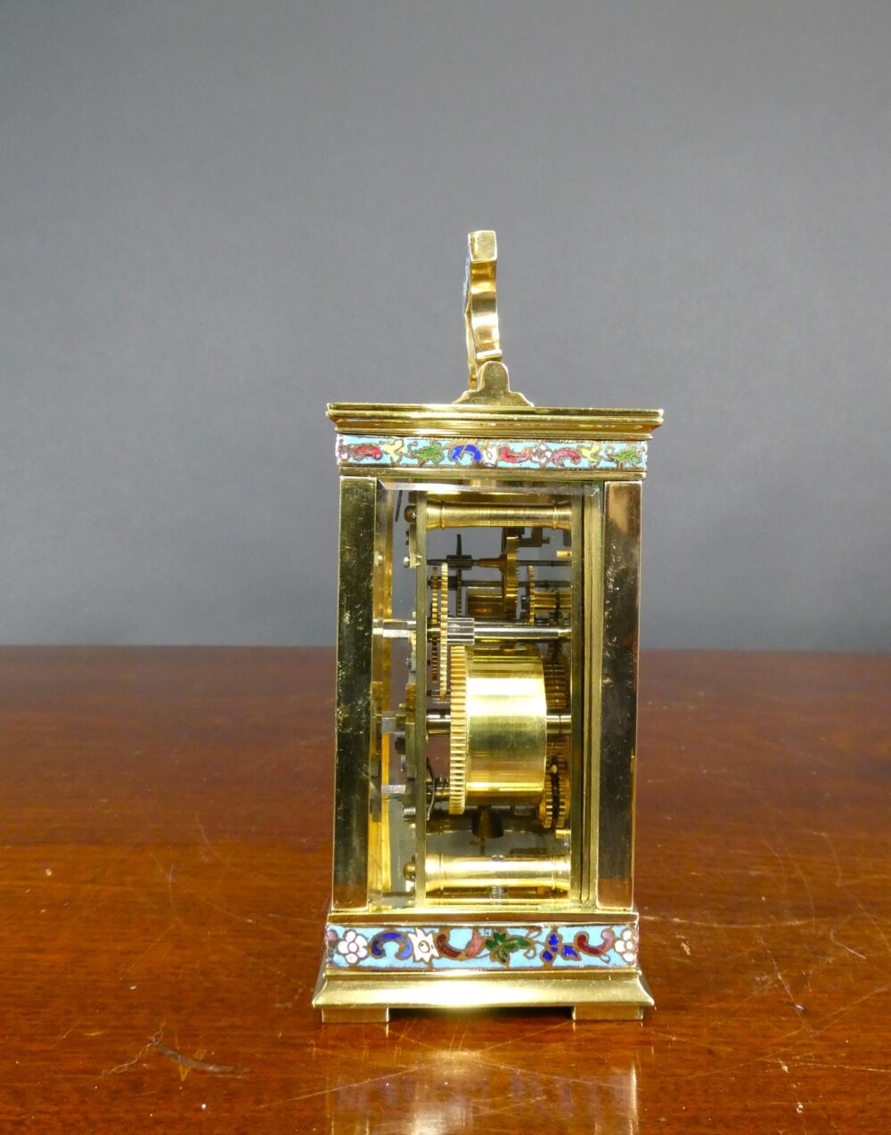 Victorian brass cased carriage clock with champleve decoration to the front, sides, rear of the case and carrying handle with bevelled glasses throughout.