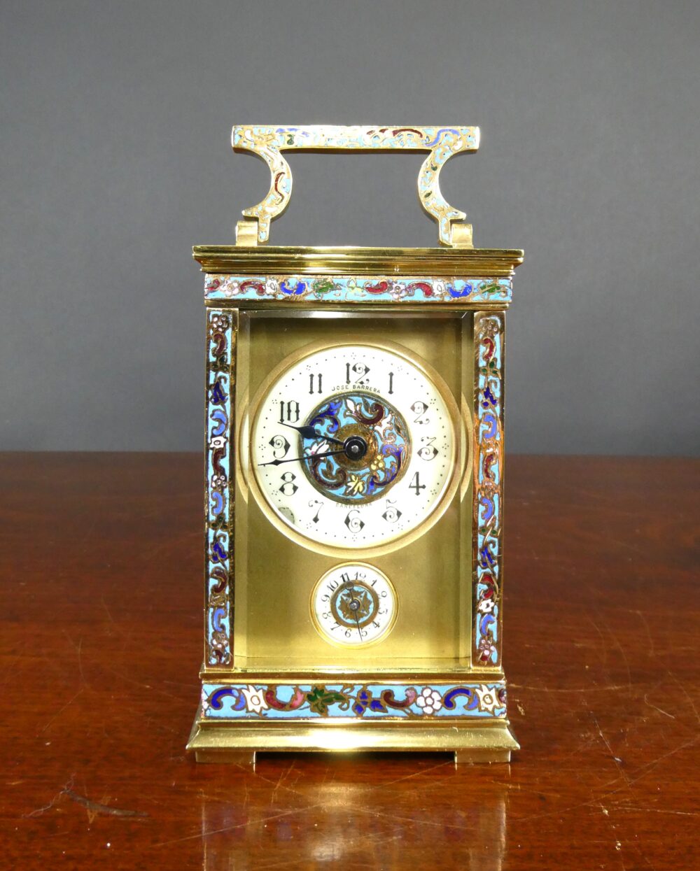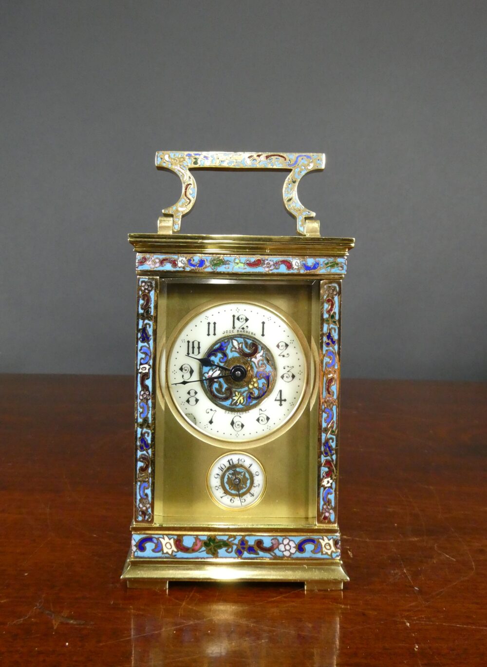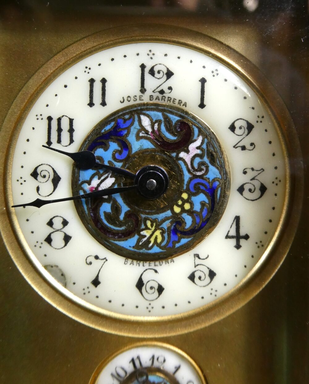 Gilded dial mask with enamel chapter ring, champleve decorated centre and Arabic numerals, original ‘blued’ steel hands. Subsidiary dial for alarm also decorated with champleve detail. The dial signed Jose Barrera, Barcelona.