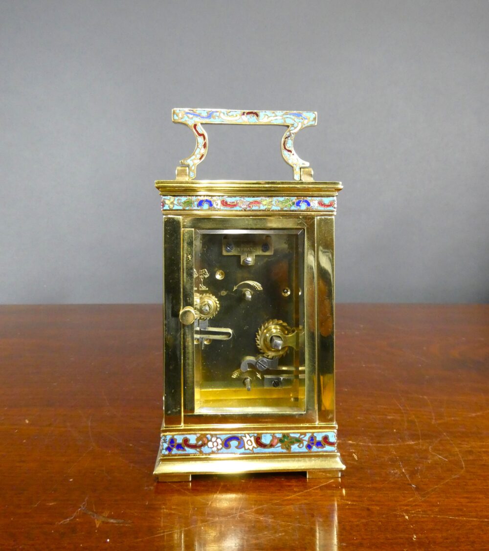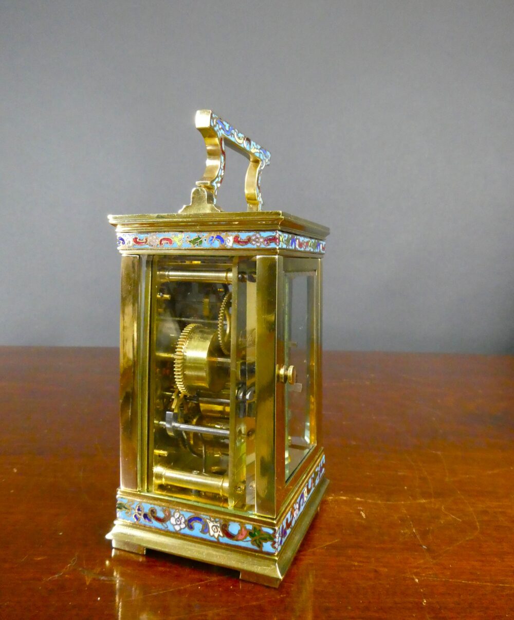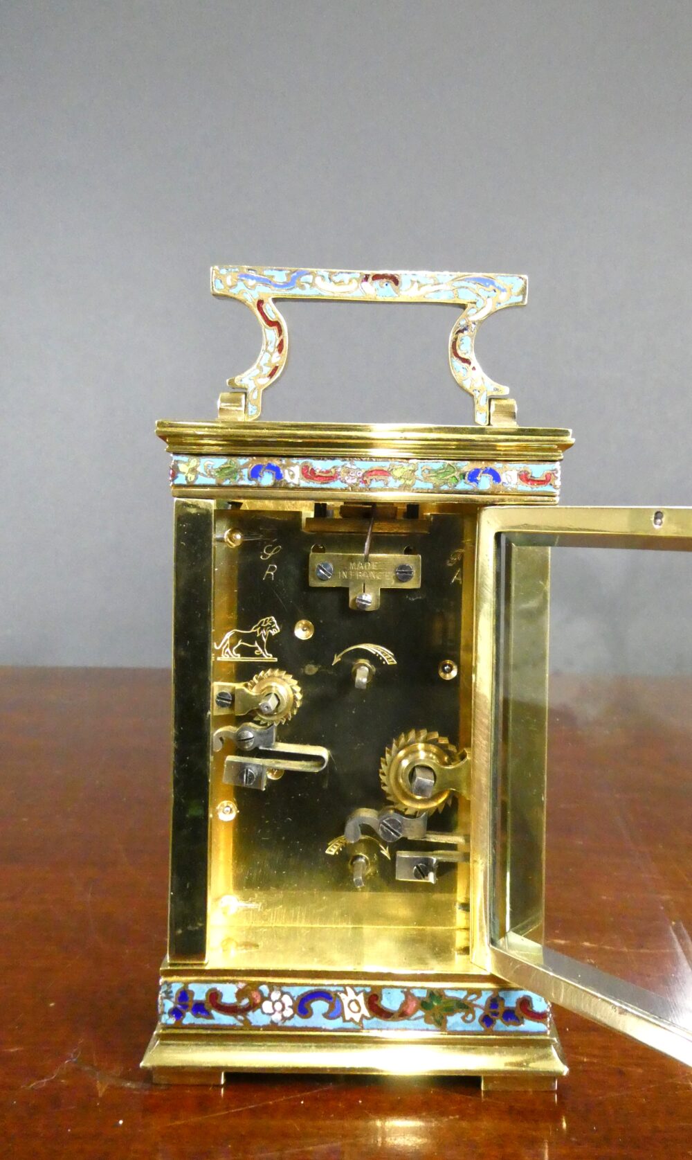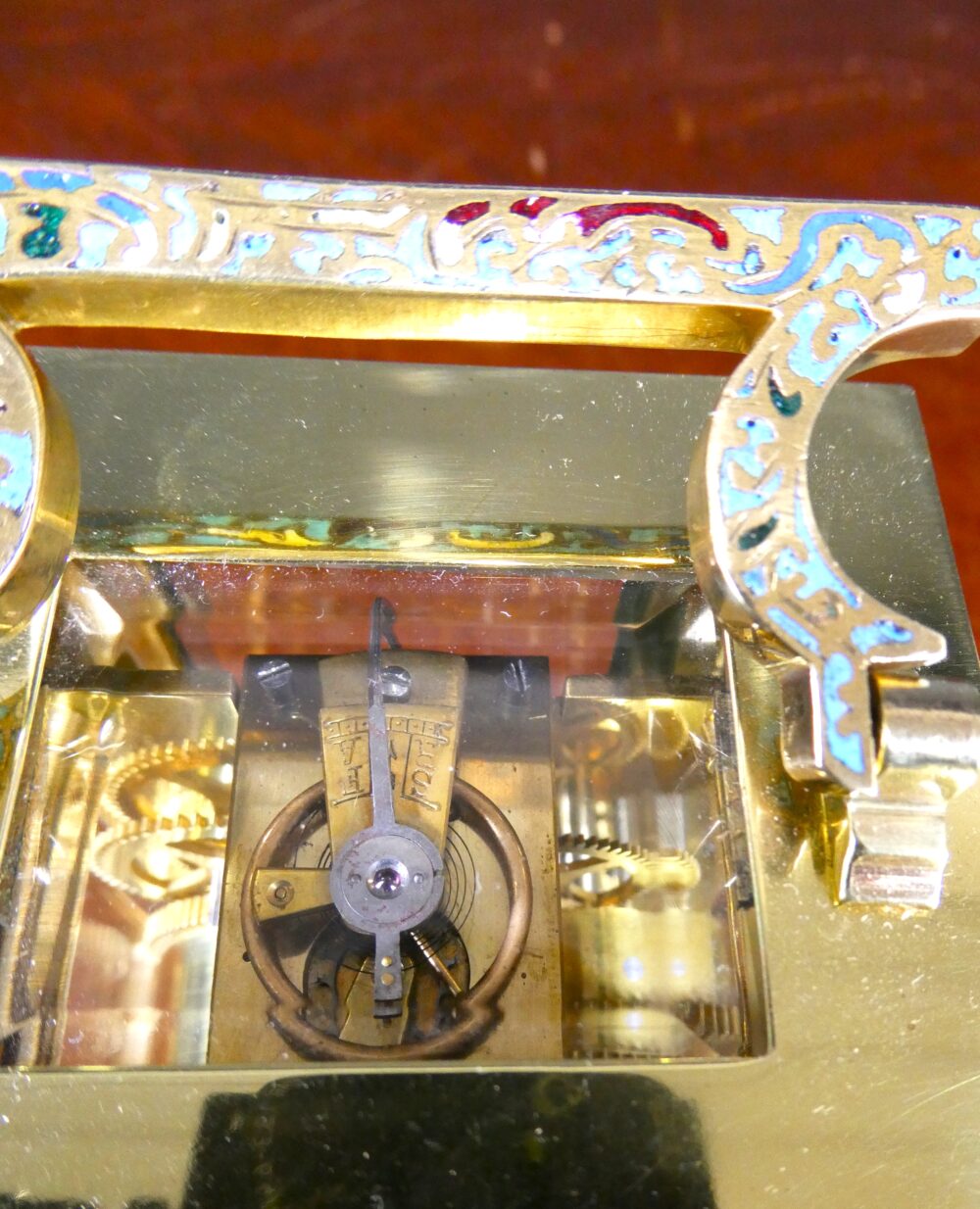 Victorian brass cased carriage clock with champleve decoration to the front, sides, rear of the case and carrying handle with bevelled glasses throughout.